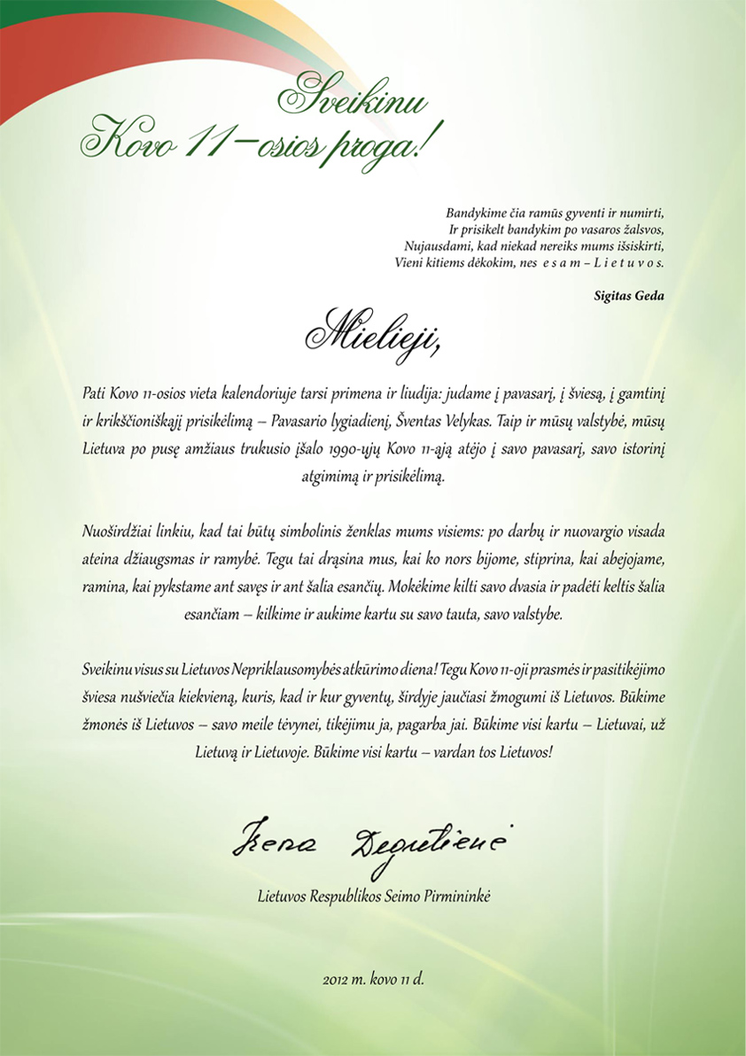 9 kovo, 2012 | Rogalando Lietuvių Bendrija Sveikinimai Kovo 11–osios proga Norvegijos Lietuvių Bendrijos sveikinimas Lietuvos užsienio reikalų ministro Audroniaus Ažubalio sveikinimas Seimo Pirmininkės Irenos Degutienės sveikinimas Dalintis: Click to share on X (Opens in new window) X Click to share on Facebook (Opens in new window) Dalintis Facebook Click to email a link to a friend (Opens in new window) Email Kaip Įkeliama... Susiję straipsniai