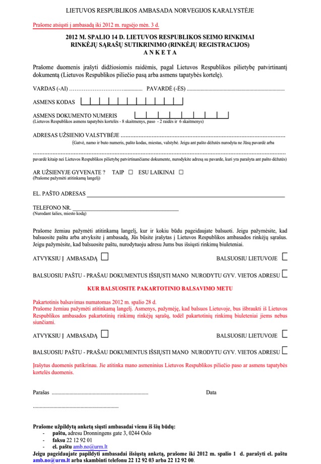 Tuo tikslu prašome užpildyti rinkėjo anketą ir ją grąžinti ambasadai iki rugsėjo 3 d. (paštu: Dronningens gate 3, 0244 Oslo, faksu 22 12 92 01 arba el. paštu amb.no@urm.lt).