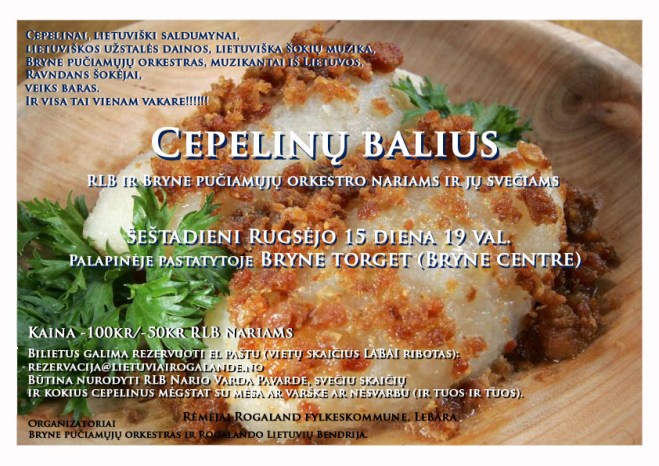 2 rugsėjo, 2012 | Rogalando Lietuvių Bendrija Rugsėjo 15d. Cepelinų balius Brynėje Dalintis: Click to share on X (Opens in new window) X Click to share on Facebook (Opens in new window) Dalintis Facebook Click to email a link to a friend (Opens in new window) Email Kaip Įkeliama... Susiję straipsniai