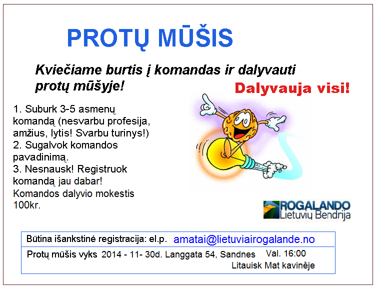 Protų mūšis vyks 2014-11-30 d. 16:00val. Langgata 54, Sandnes, Litaisk Mat kavinės patalpose.