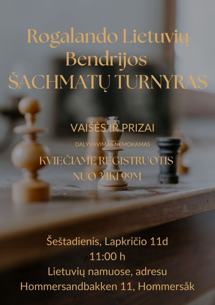 20 spalio, 2023 | Rogalando Lietuvių Bendrija Šachmatų turnyras vaikams ir suaugusiems Šachmatų turnyras vaikams ir suaugusiems. Registracija: https://forms.gle/kidGHJYPPGhGqDqY8 Dalintis: Click to share on X (Opens in new window) X Click to share on Facebook (Opens in new window) Dalintis Facebook Click to email a link to a friend (Opens in new window) Email Kaip Įkeliama... Susiję straipsniai