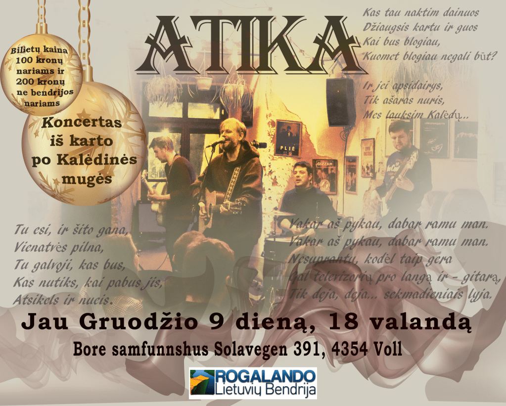 26 spalio, 2023 | Rogalando Lietuvių Bendrija Atika koncertas Dalintis: Click to share on X (Opens in new window) X Click to share on Facebook (Opens in new window) Dalintis Facebook Click to email a link to a friend (Opens in new window) Email Kaip Įkeliama... Susiję straipsniai