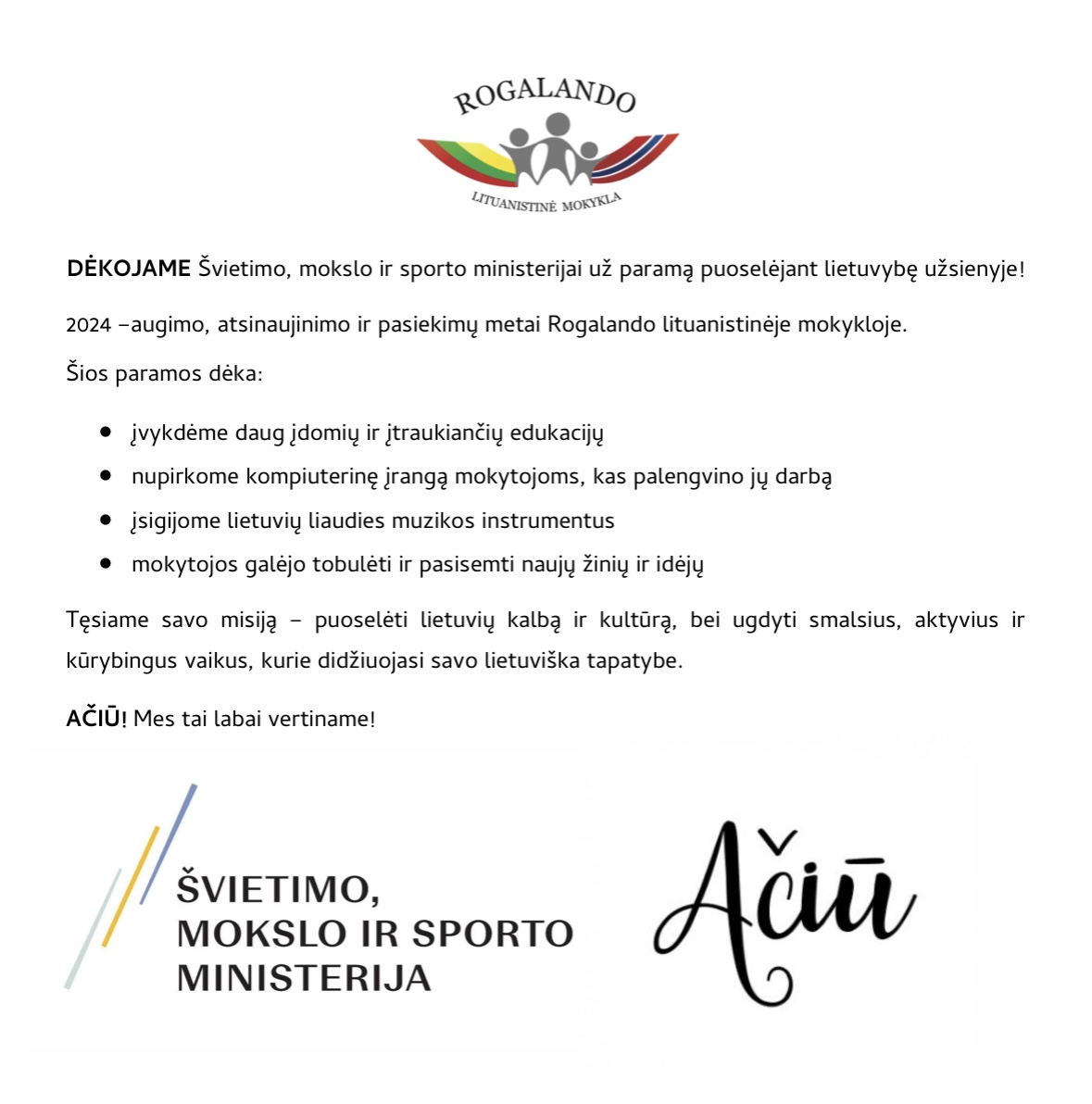 Dėkojame ir jums, mieli tėveliai – už tai, kad esate mūsų dalis, kad skiriate savo laiką, energiją ir meilę tam, kad jūsų vaikai galėtų ne tik mokytis lietuvių kalbos, bet ir jausti ryšį su savo šaknimis. Jūsų palaikymas yra mūsų stiprybė.